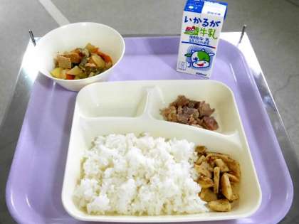 今日の献立は、ごはん、牛乳、鶏肉の照り焼き、じゃがいもと厚揚げの煮物、ごまかかいためでした。
