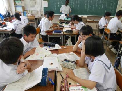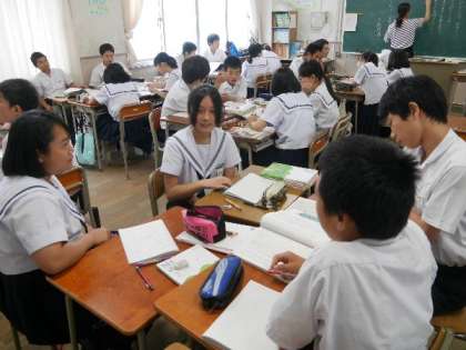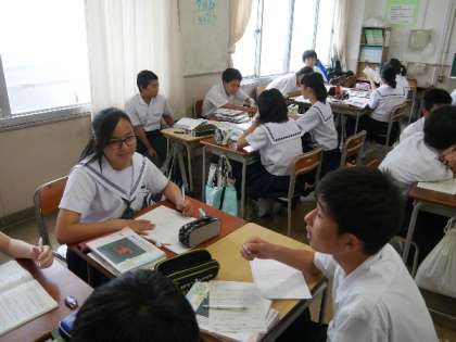 なにやら班で話し合っています。他人の意見を聞いたり、自分の意見をまとめて言ったりすることは、学力を高めるのにとても必要なことなんです。発言すると自分の考えもまとまってくるんです。