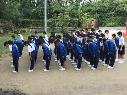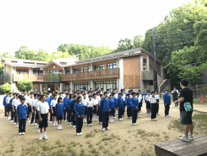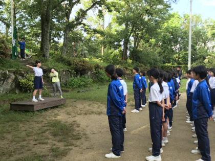 起床して全員集合し、朝の集いを行いました。昨日は天気が悪く、できなかった校旗を掲揚しました。