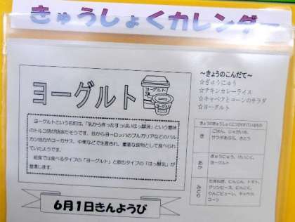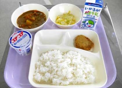 今日の献立は、チキンカレーライス、牛乳、キャベツとコーンのサラダ、ヨーグルトでした。1年生の野外炊飯と同じメニューのカレーでしたね。
