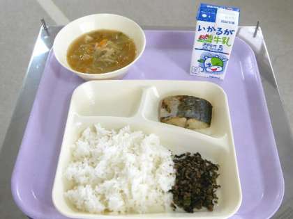 今日の献立は、ごはん、牛乳、さごしの塩焼き、味噌汁、牛ひじきそぼろでした。今日もおいしかったです。