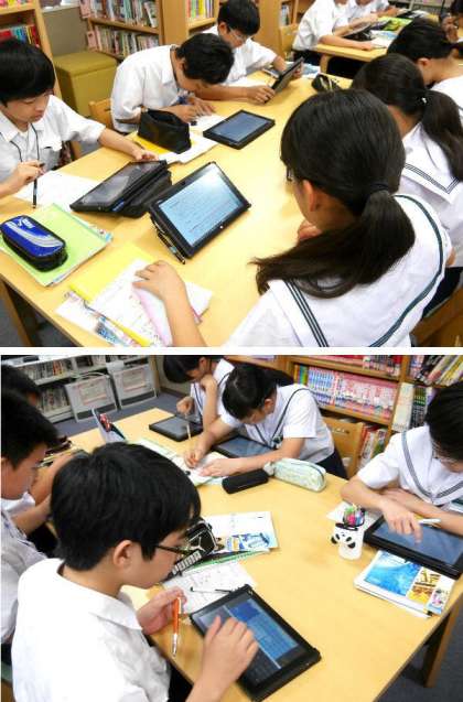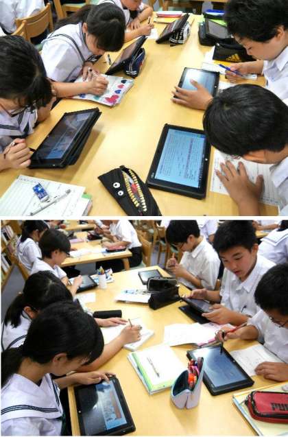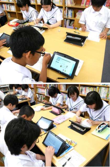 1年生が図書室でタブレットを使って学習しています。インターネットに接続して植物の種類について調べていました。調べたことをノートにまとめています。