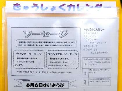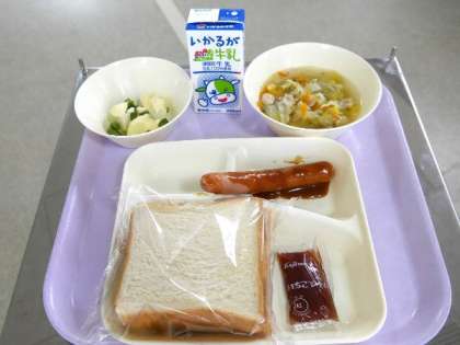 今日の献立は、食パン、牛乳、ウインナーのケチャップソース、野菜スープ、じゃがいもとサンド豆のサラダでした。サラダにはマヨネーズがついています。