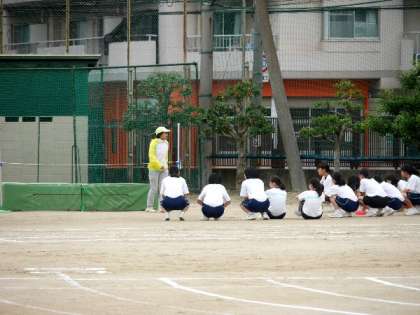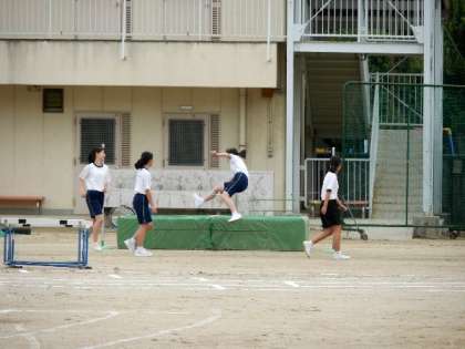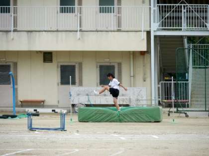 3年女子が砂場で高跳びの体育の授業をしています。何cm跳べるかな。