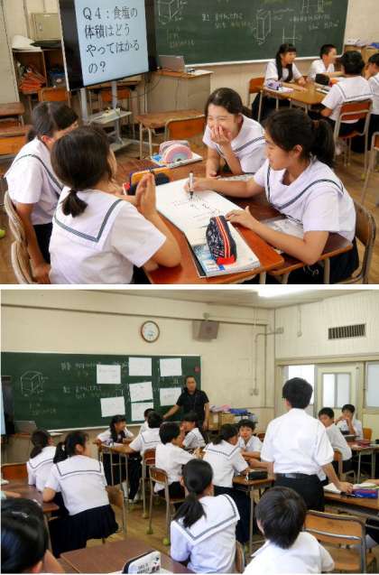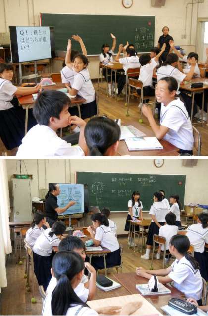 今日は、校内の研究授業をおこない、授業力の向上をめざして、先生がだが分かれて参加しました。1年生の理科の授業では、大型プロジェクタを使って、質問や写真などを大きく映し出しわかりやすかったです。生徒たちもいろいろな発問に熱心に考えて答えていました。ホワイトボードを使ってチームで考えて発表をしていました。