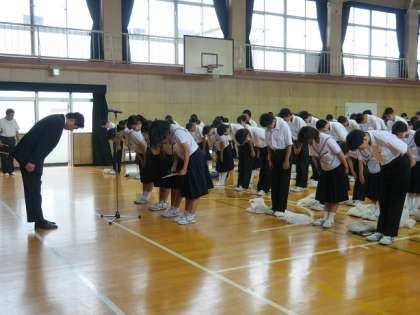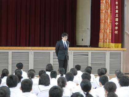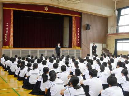 今日の全校集会では、5月28日から始まった3週間の実習を終える教育実習の先生が生徒の皆さんにご挨拶をされました。挨拶の中では、将来は先生になりたいという思いを話されていました。実習で得た経験を生かし、大学での勉強に励み、先生になられることをみんなで応援したいと思います。