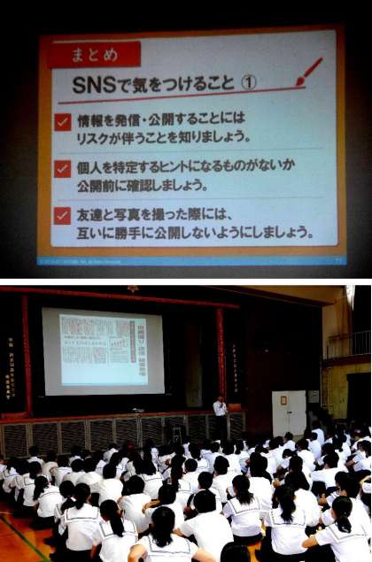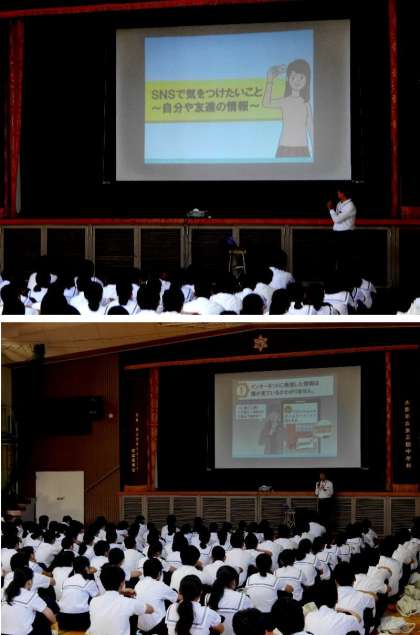 ドコモから講師先生にきていただき、全校生徒にスマホや携帯電話などの使い方を学習しました。特にSNSなどの利用でしらないと危険なことなど、具体的な事例に基づいて教えていただきました。マナーやモラルを守って正しく使うと便利ですが、知らないとトラブルに巻き込まれることもありますね。