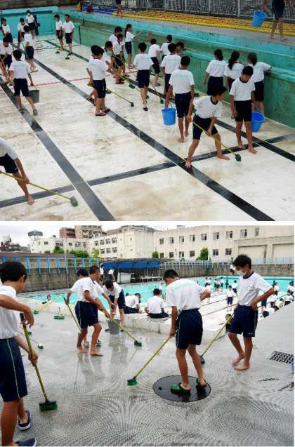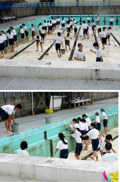 2年生がプール掃除をしていました。1年間おいておくと、だいぶ汚れていますね。今年は少し寒かったしますが、いよいよプールの授業が始まります。