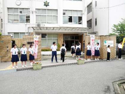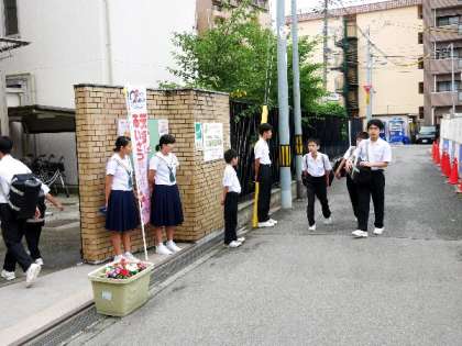 朝の登校風景です。風紀委員と生徒会が朝にそろって挨拶をがんばってくれています。