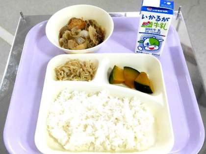 今日の献立は、ごはん、牛乳、すき焼き煮、焼きカボチャの甘蜜かけ、もやしのごま酢あえでした。すきやき最高です。ごはんがおいしいです。