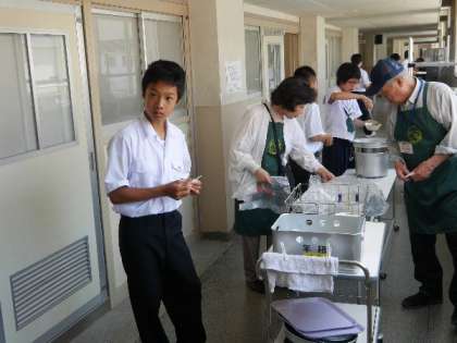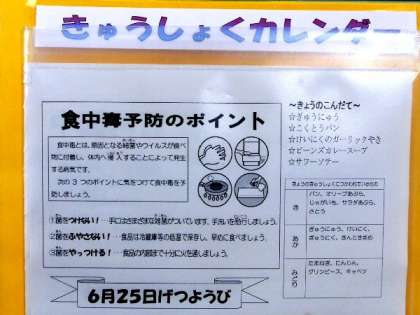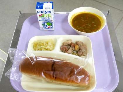 今日の献立は、黒糖パン、牛乳、鶏肉のガーリック焼き、ビーンズカレースープ、サワーソテーでした。