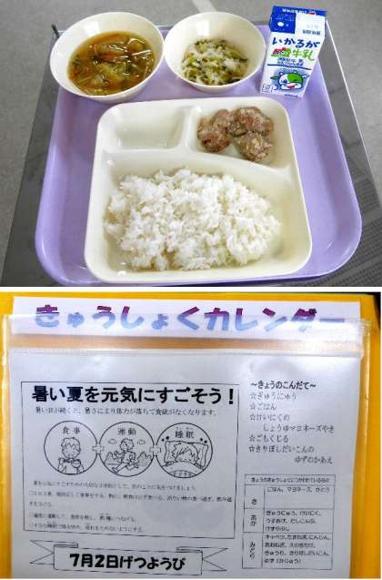 今日の献立は、ごはん、牛乳、鶏肉の醤油マヨネーズ焼き、五目汁、切り干し大根のゆずの香和えです。