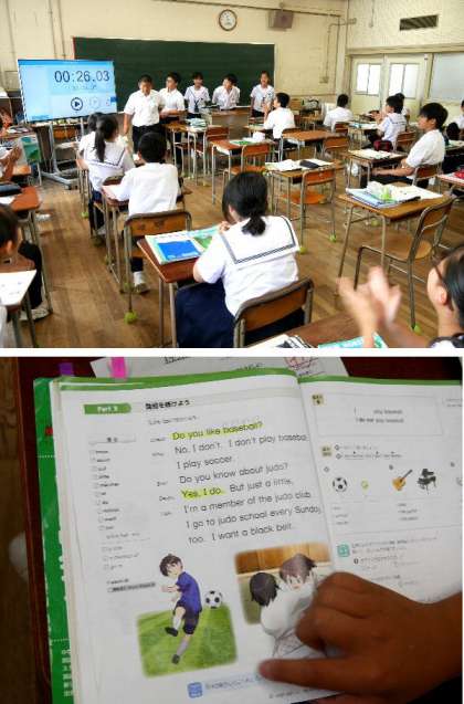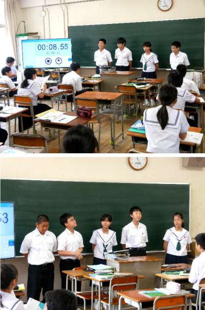 1年生の英語の授業です。班になって教科書のページを役割分担して暗唱しています。最後までつまらずに暗唱できると拍手がおこります。なかなか発音もよくなってきましたね。