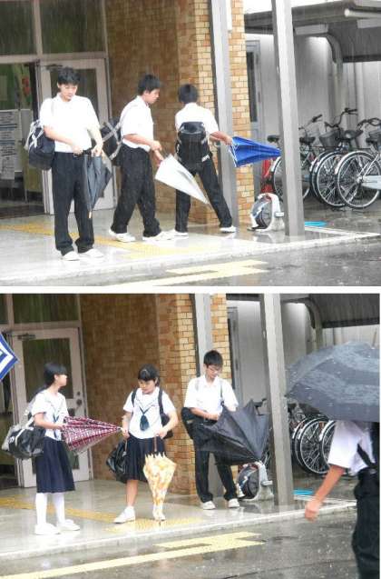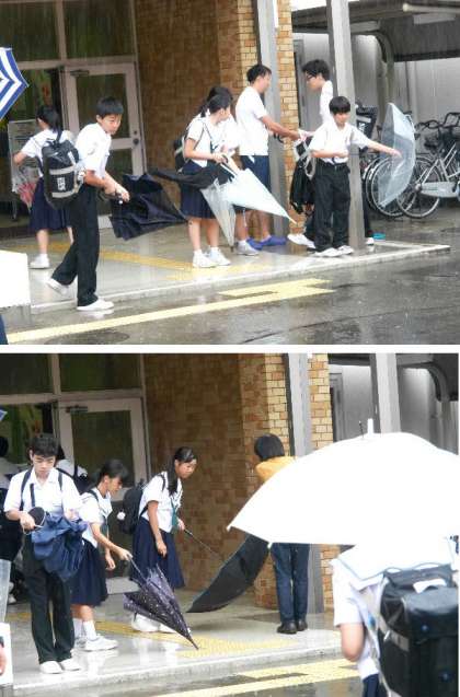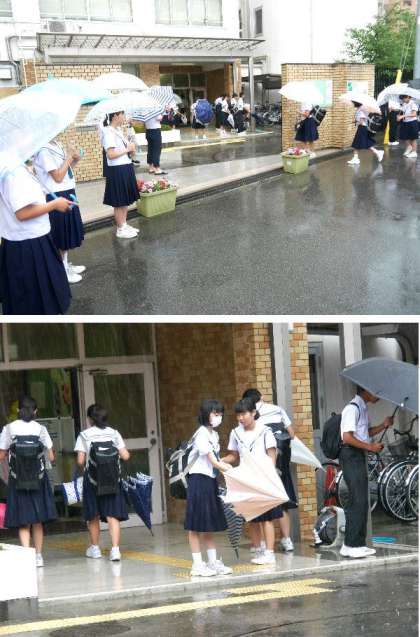 今日は朝から大雨です。登校時と重なって大変です。学校では雨でも風紀委員があいさつ運動でがんばっていのます。入館する前には傘の雨水をしっかり落とします。