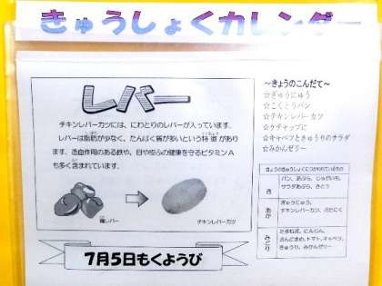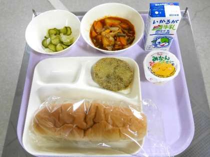 今日の献立は、黒糖パン、牛乳、チキンレバーカツ、ケチャップ煮、キャベツとキュウリのサラダ、みかんゼリーと豪華です。