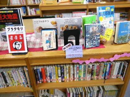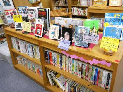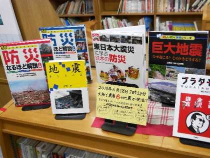 本の紹介では、先日あった大阪北部地震にちなんで、防災関係の本もたくさん展示されています。