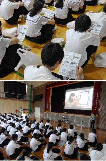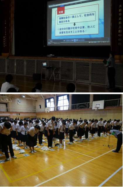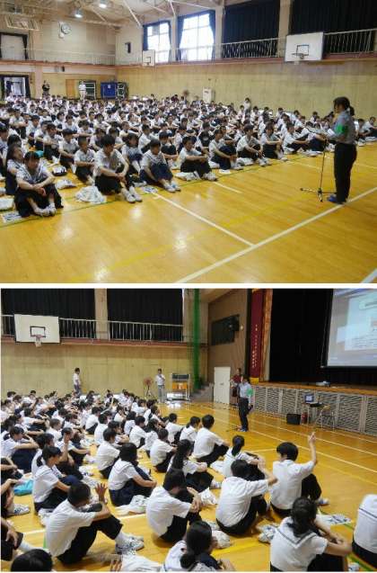淀川警察の少年係の方に来ていただき、生徒たちに防犯教室をひらいていただきました。スマホなどのSNSで被害にあった事例や、逆に加害になった例などのビデオを見て、お話を聞きました。もうすぐ夏休みです。気をつけて考えて取扱いに注意してほしいですね。