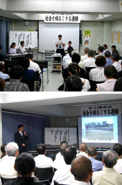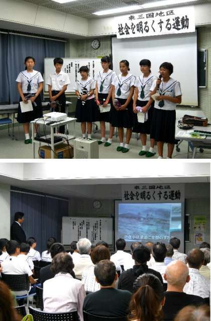 7月6日(金)、夕方より東三国センターで、社会を明るくする運動が行われました。東三国中学校からは、ジュニアリーダーが東北ボランティア研修の成果をビデオを見てから報告しました。