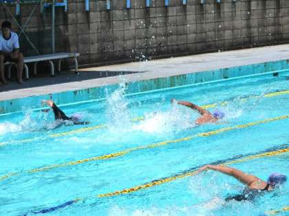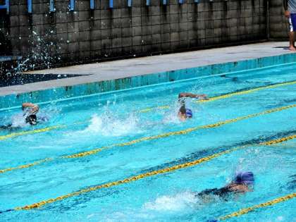 3年生がプールでタイムを計っています。大雨だったので、今日はひさしぶりの青空でプール日和です。タイムはどうだったでしょうか。