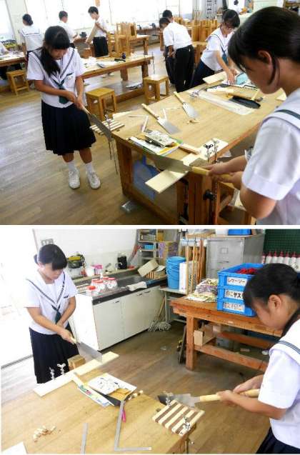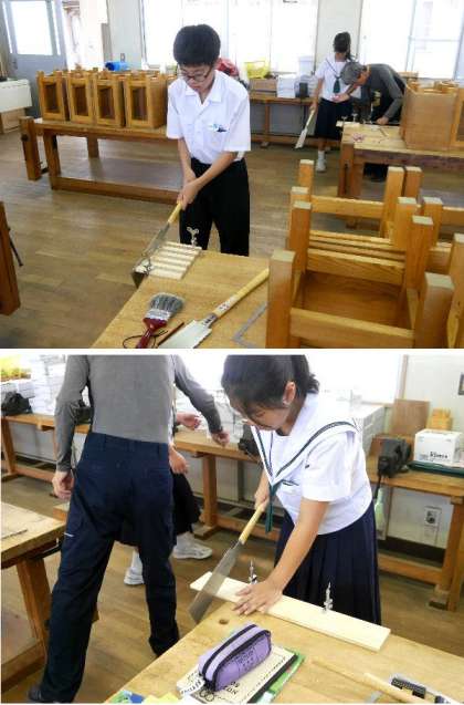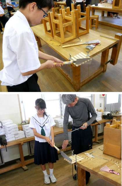 1年生の技術では、いよいよのこぎりで木材を切っていきます。まっすぐ切るのはむずかしいですね。身体と目線をあわせて、のこぎりの特性を知って切っていきましょう。