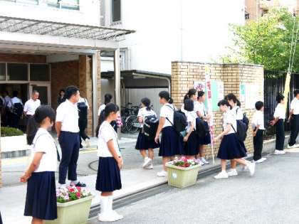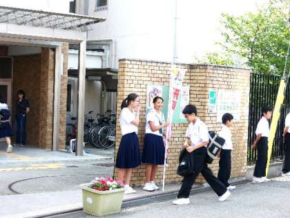 毎朝、登校時に風紀委員がそろってあいさつ運動をしてくれています。毎日暑いけどがんばってやっています。