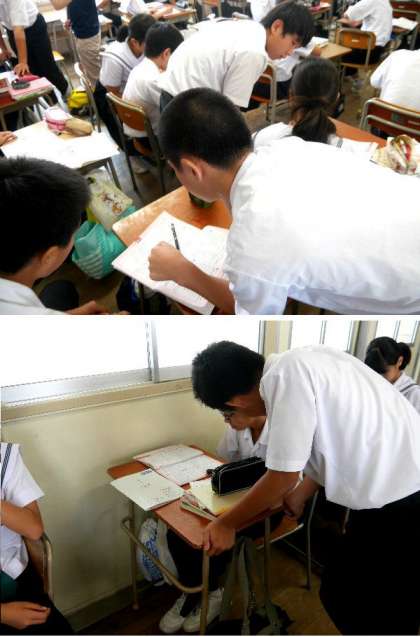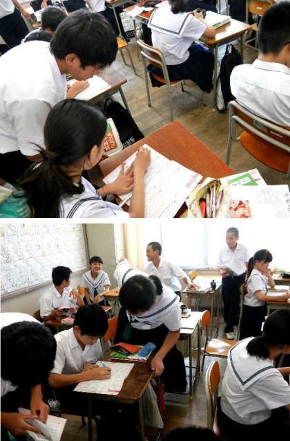 2年生の国語で、問題集でわからないところを教えあっています。教えることはさらにその生徒の学習効果がたかまります。