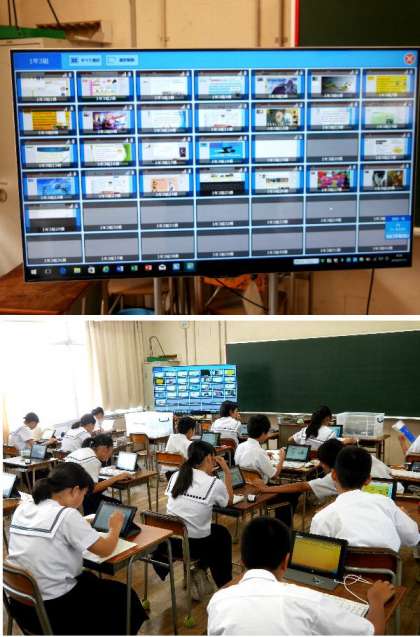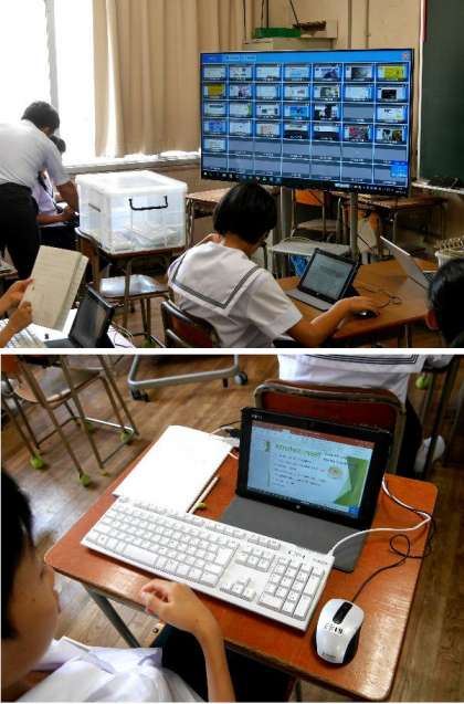 2年生の英語では、タブレットで自己紹介のプレゼン画面を作っています。生徒のそれぞれの画面を先生のパソコンで集約してすべて見ることができるんです。最近の技術はすごいですね。