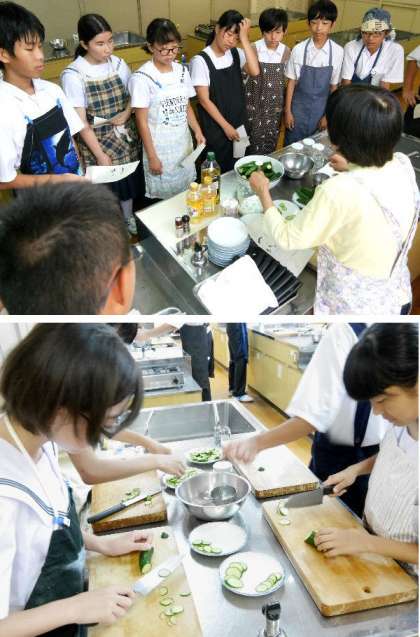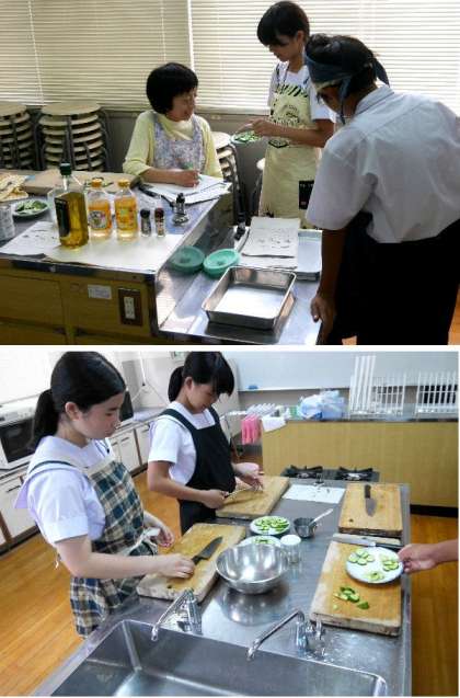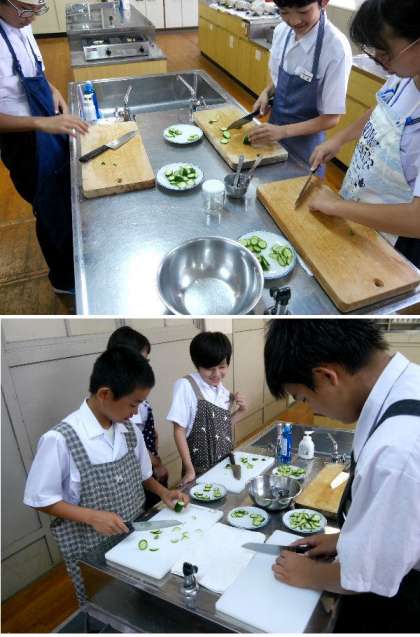 1年生の家庭科では調理実習できゅうりの輪切りに挑戦しています。いろいろな切り方をチャレンジして、先生に一人づつチェックしてもらっています。切ったキュウリを使ってサラダを作って試食します。