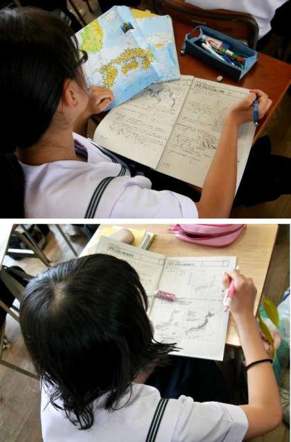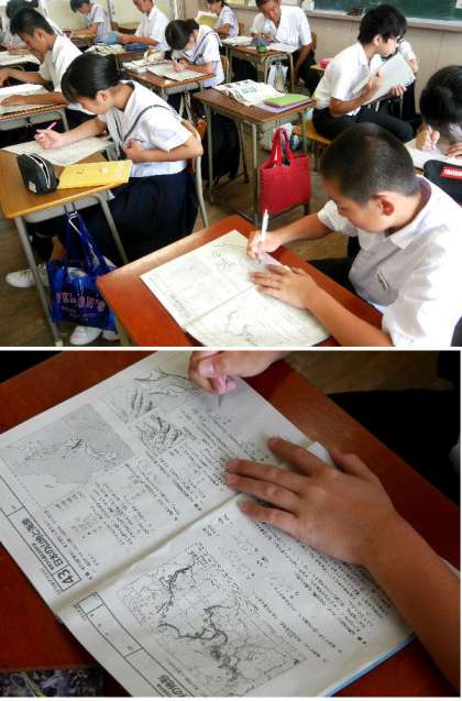 2年社会科の授業です。今までの授業の確認のためにプリント学習をしています。大阪市ではインターネットで問題データベースを自由に取り出して活用することができるようになっています。5教科のすべての単元の膨大な問題を自由に使うことができるので、授業でも活用されています。