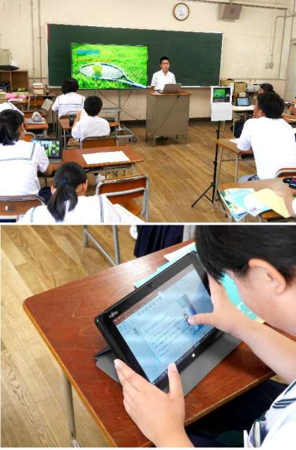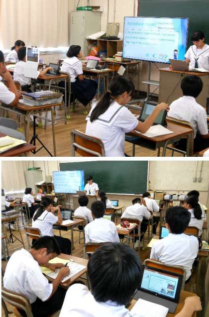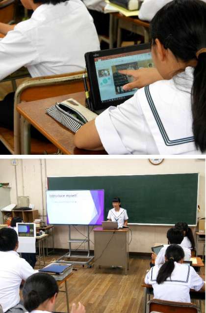 1年生の英語の授業では、タブレットを使って英語で自己紹介文をプレゼンソフトで作っていました。今日は発表会です。皆の前で英語で話して発表しています。