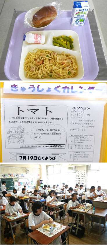 1学期最後の給食でした。献立は、黒糖パン、牛乳、シーフードトマトスパゲッティ、グリーンアスパラとコーンサラダ、発酵乳でした。ごちそうさまでした。