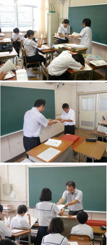 1学期終業式のあと、各学級では、たくさんの配布物やプリントなどが配られ、夏休みの諸連絡や注意がありました。通知表が各担任から手渡されました。