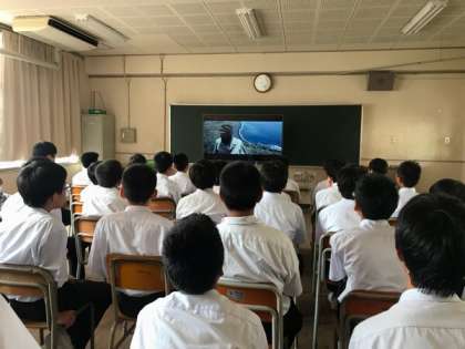 学年全体が格技室に集合したあと、多目的室に分かれて平和学習を行いました。少し長い映像でしたが、みんなしっかりと見ていました。