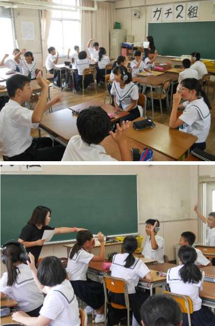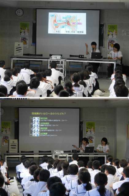 1年生は、体験学習として、難聴などの障がいについて体験学習をおこないました。ヘッドフォンからはずっと雑音がながれています。それをつけて聞こえにく状況を体験して、聴覚障がいの生活を学習しました。また、府立中央聴覚支援学校の先生方に出前授業に来ていただき、聴覚のしくみや、聴覚障がいについて教えていただきました。