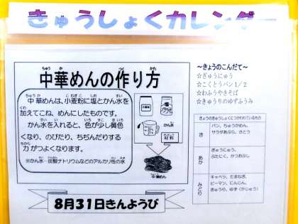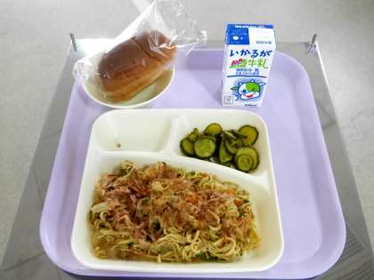 今日の献立は、黒糖パン、牛乳、和風やきそば、キュウリのゆず風味でした。
