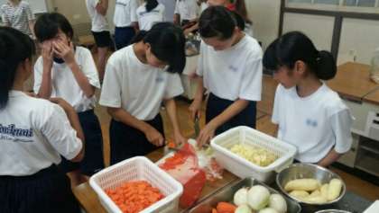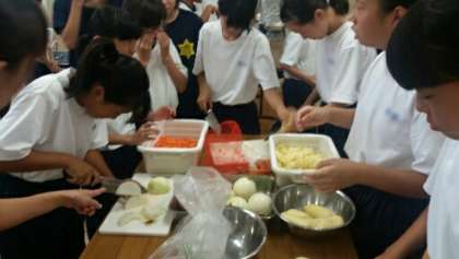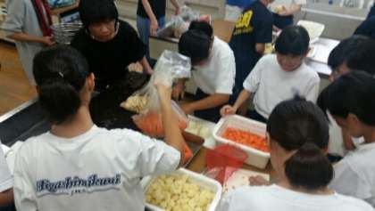 ジュニアリーダー達が新東三国小学校での校庭キャンプのお手伝いをしています。カレーづくりの準備です。