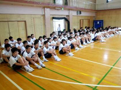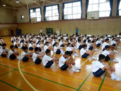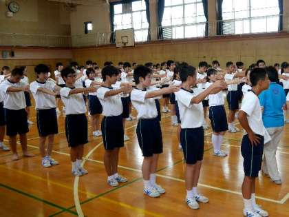 3年生が体育館で体育大会の練習をしました。3回目の体育大会ということで、さすがに皆がそろって力強い行進やかけ声で頑張っていました。