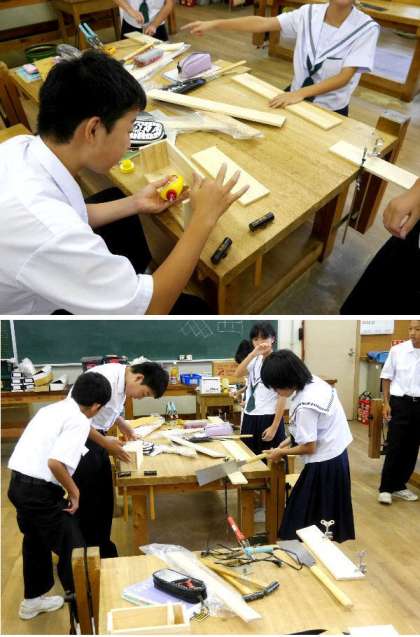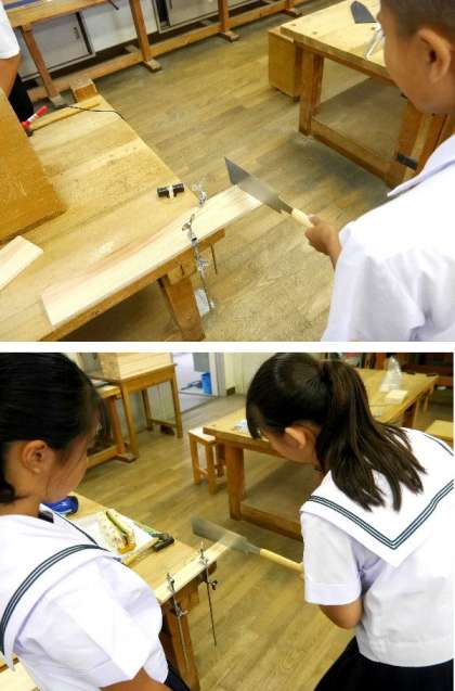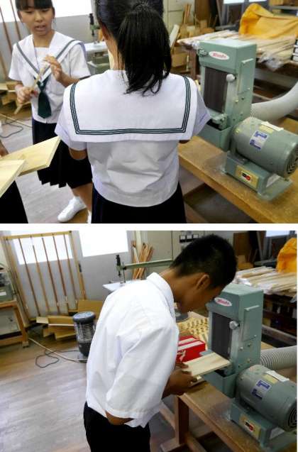 1年生の技術では、自分で設計した小物入れを作っています。両刃のこぎりで切断して、切断面をベルトサンダーで整えています。早い人は木工ボンドをつけて仮組み立てをしていました。