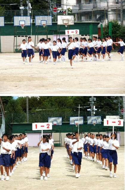 運動場で体育大会の練習が始まりました。1年生がしっかり声をだして行進しています。体育館と違って音が干渉するのであわすのが大変ですが、がんばっています。