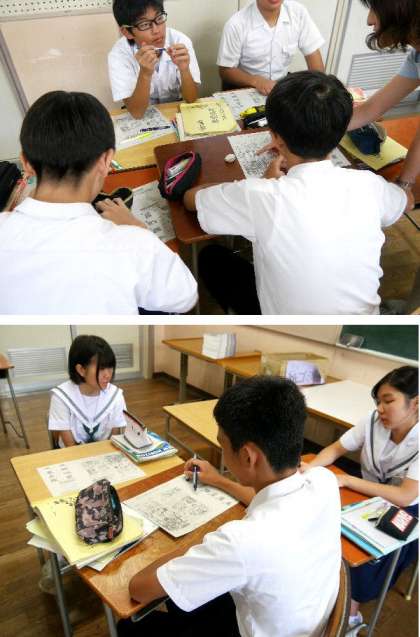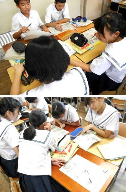 3年生の英語の授業です。英語のふきだしが書かれた漫画を読み取っています。けっこう難しいですが、絵があるので読み取ろうとがんばっています。