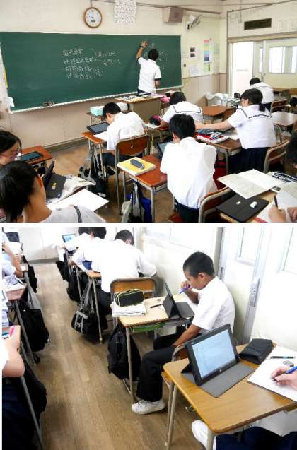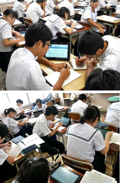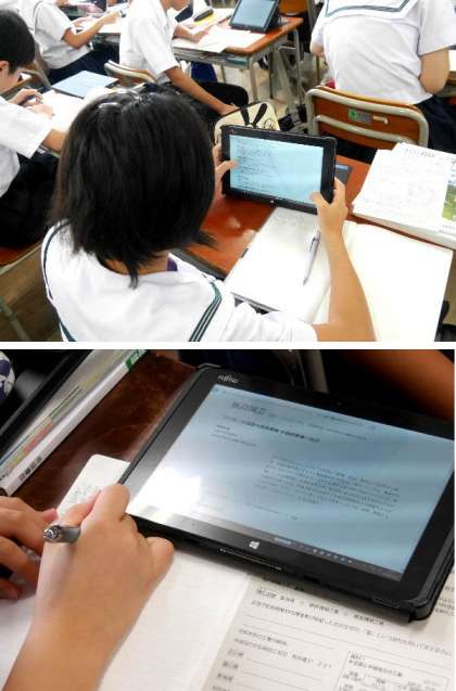 2年の社会の授業です。生徒たちがタブレットを使って、インターネットで調べています。園芸農業について違いを調べて、プリントにまとめていました。
