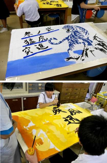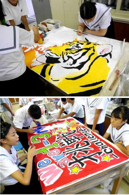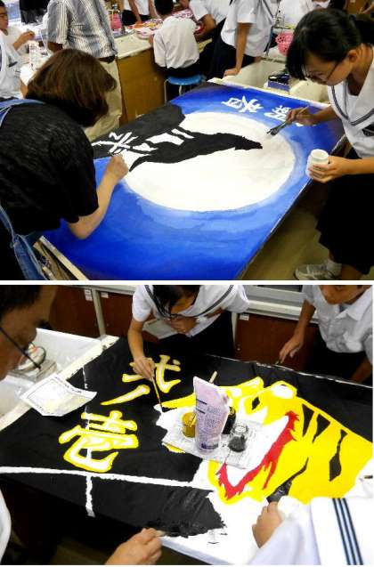 各学級の体育大会の応援旗もできあがってきました。カラーの配色もよく、といもいい感じにしあがっています。