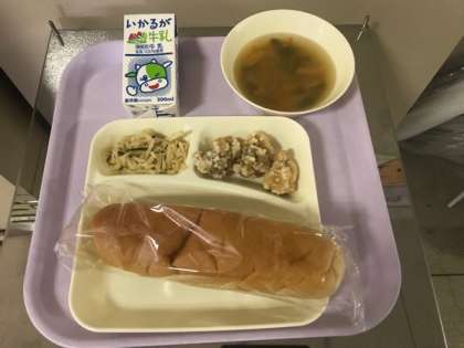 今日の給食は、鶏肉のからあげ、とうがんの中華スープ、切り干しだいこんの辛味づけ、牛乳でした。