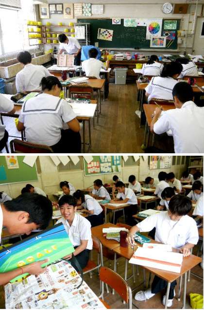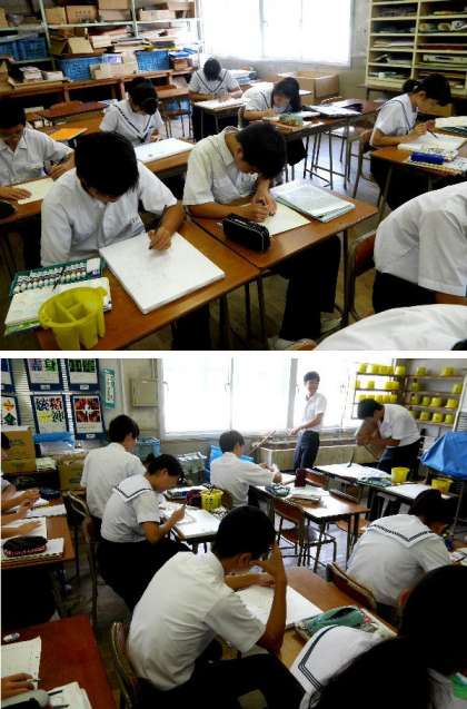 3年美術では、1点透視で建物などを画いて色をつけていきます。細かい作業です。