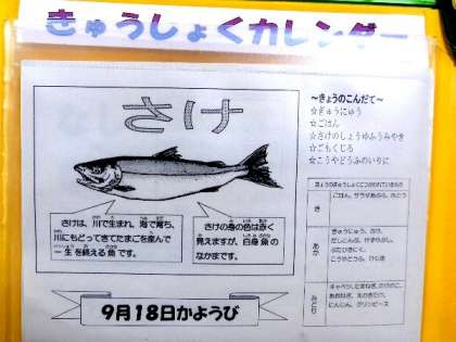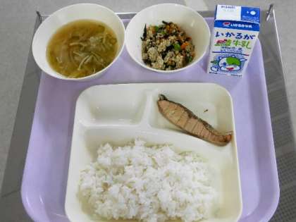 今日の献立は、ごはん、牛乳、鮭の醤油風味焼き、五目汁、高野豆腐のいりにでした