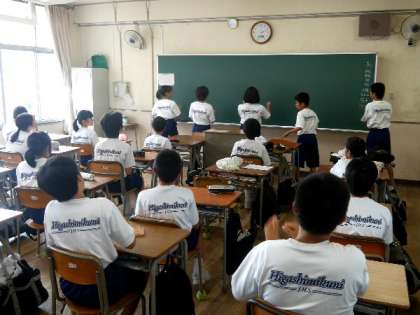 1年生が教室で応援合戦の練習をしています。声をだしてもりあがっています。