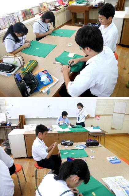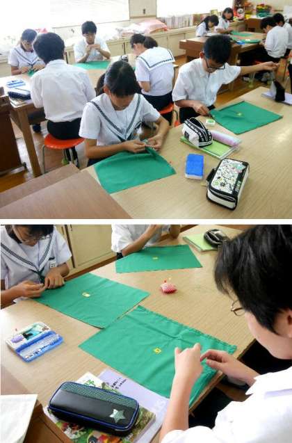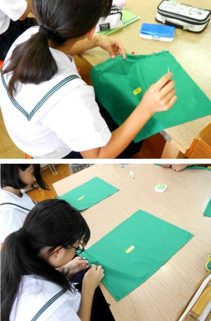 1年生の家庭科ではランチョンマットを作っています。布のふちを自分でまつり縫いします。ていねいにしあげて、給食でつかえるランチョンマットにしましょう。