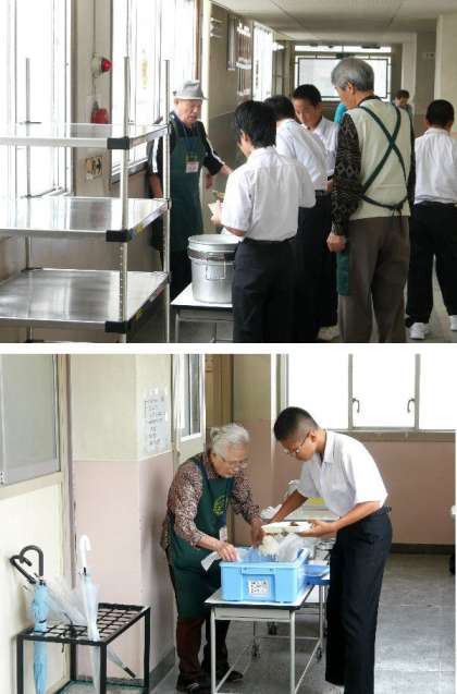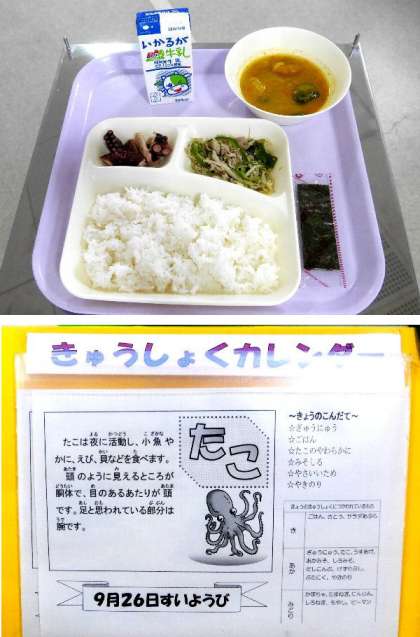 今日の献立は、ごはん、牛乳、タコのやわらか煮、みそしる、やさい炒め、焼きのりでした。いつも元気アップボランティアさんありがとうございます。