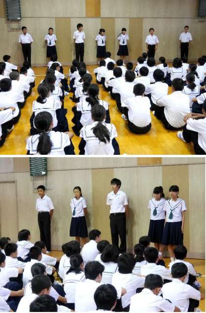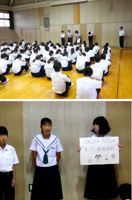毎週、各学年とも学年集会があります。1年の学年集会では、風紀委員から更衣調整期間のお知らせがありました。また、保健委員会からの反省も発表されていました。