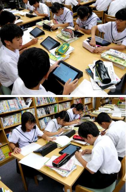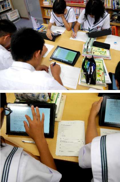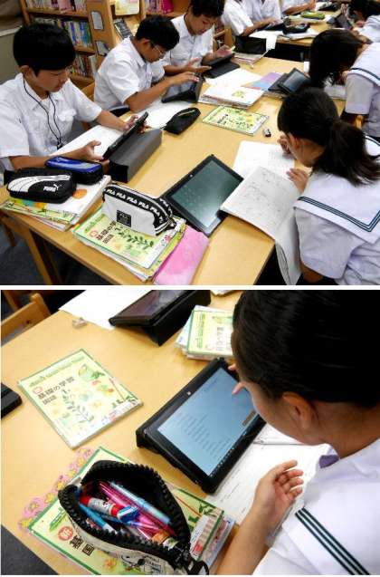 1年生が図書室で、タブレットを使って調べています。だいぶ使いこせるようになってきましたね。